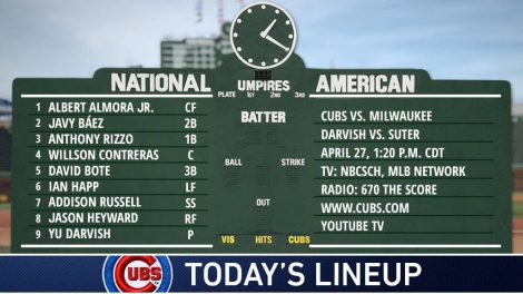 The Chicago Cubs take on the Milwaukee Brewers at Wrigley Field tonight. Here’s the Cubs starting line-up.Cubs Kris Bryant out of Cubs starting...